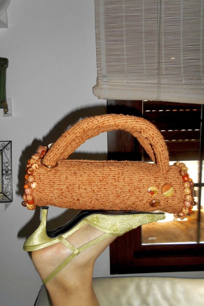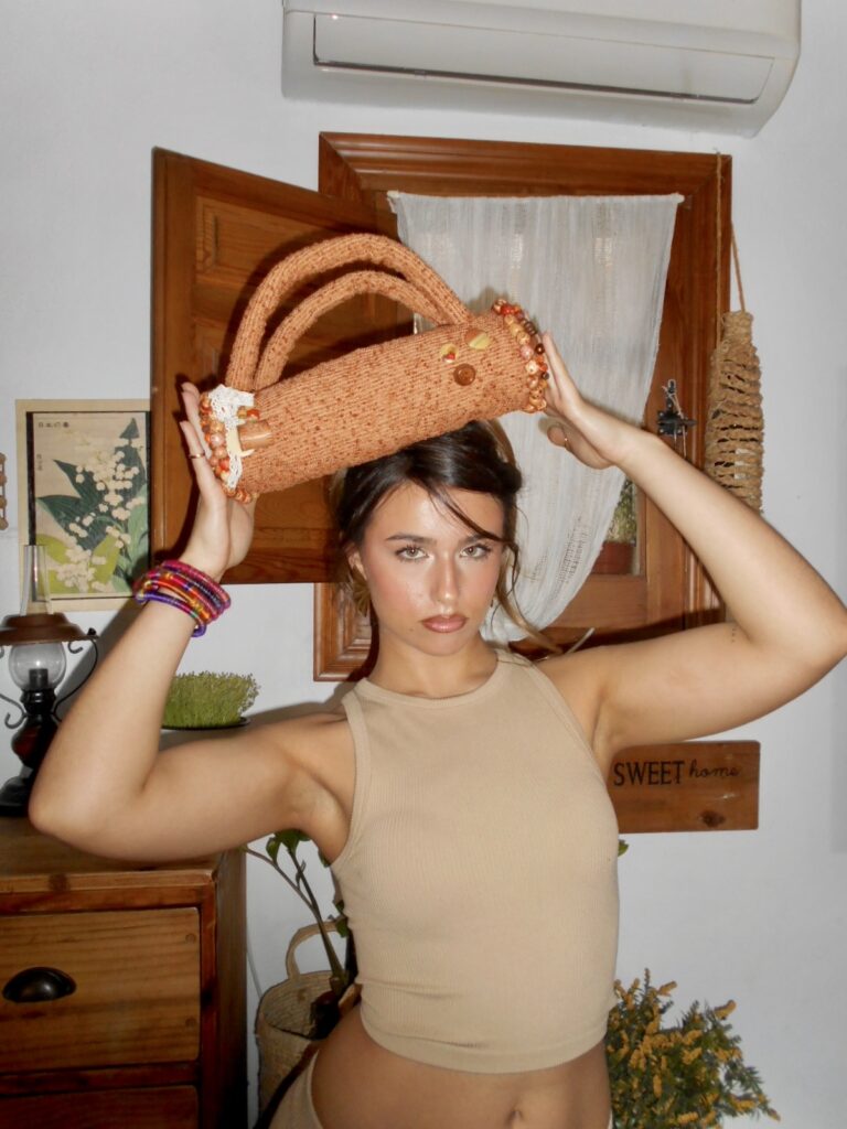 Este bolso está inspirado en la colección de Hawaii "Poe Poe". El tejido hace referencia a la arena rocosa de la isla, junto con accesorios de origen natural, como las bolas de madera que hay en los laterales.